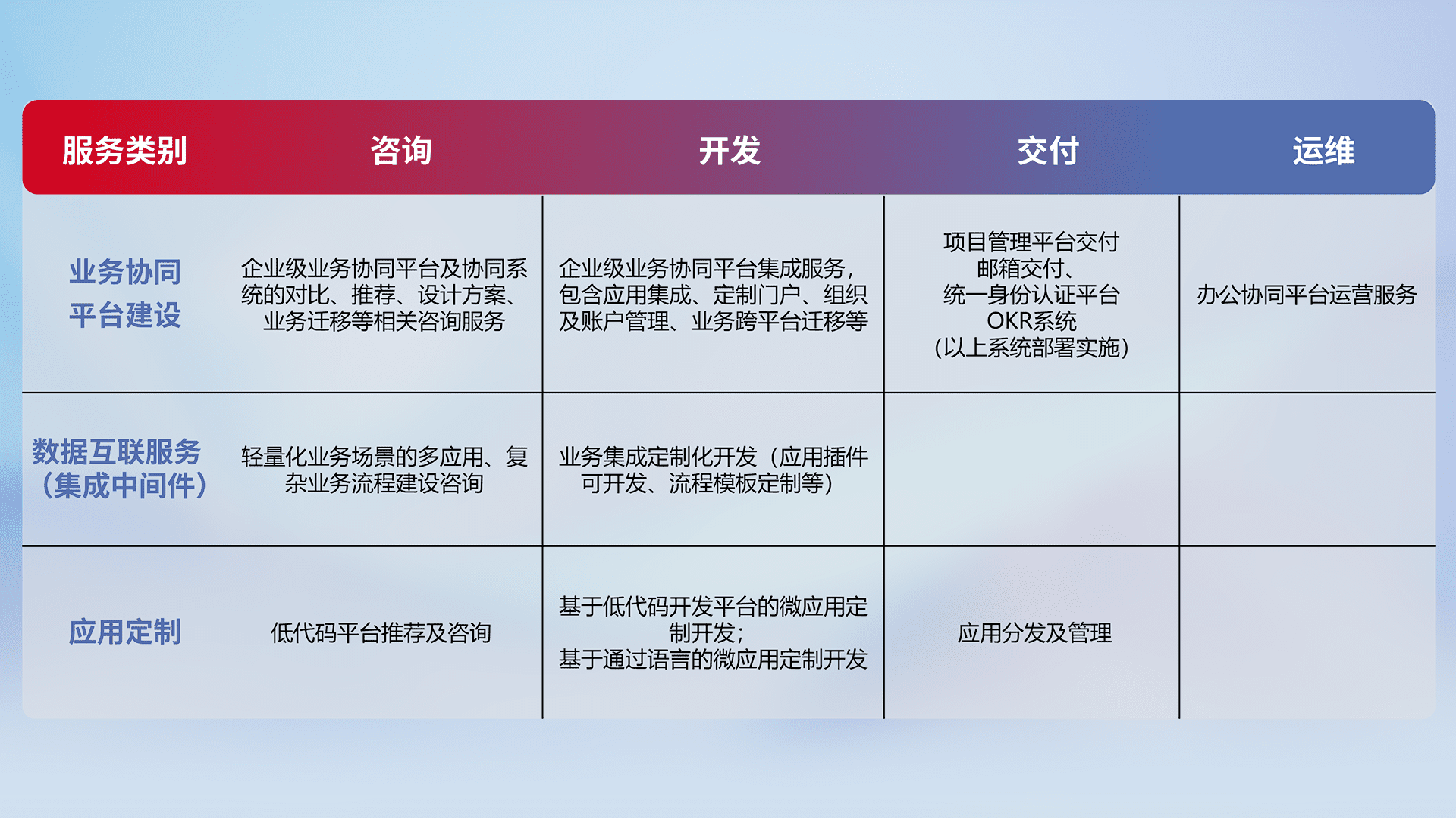针对钉钉、、、、企微、、、IDaas等平台级产品提供产品的规划、、、方案、、、交付、、定制化开发等服务,,,实现如统一协同办公、、、、智能客户服务、、、混合会议管理、、、智能数据查询、、、、等业务场景,,实现数字化转型。。