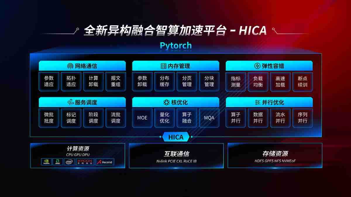 通过自研的服务层、、中间适配层、、、、以及调度编排算法,,,采用数据并行、、、模型并行等多种并行方式,,,把并行计算任务进行有效的分解,,,,使其分别由相应的软件栈和算力资源来承接。。当GPU资源变化,,,HICA可以实时动态调度计算子任务并调整模型拓扑和架构,,以充分聚合各种算力资源。。。。