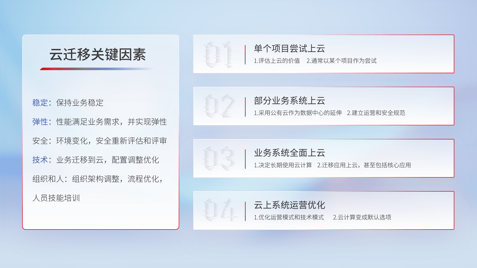 结合实际业务,,,从规划设计、、云平台选型、、、、云原生改造、、数据迁移、、、、集成交付,,,迁移全过程为客户识别最佳上云路径,,,做好风险识别管理,,设计网络架构、、、、身份权限、、、、安全审计合规、、操作审计、、日志审计、、、监控告警策略、、、、多站点容灾设计等,,对云上基础设施进行整体规划,,提升IT治理水平,,,以满足弹性、、、、高可用、、、、高性能的需求。。。