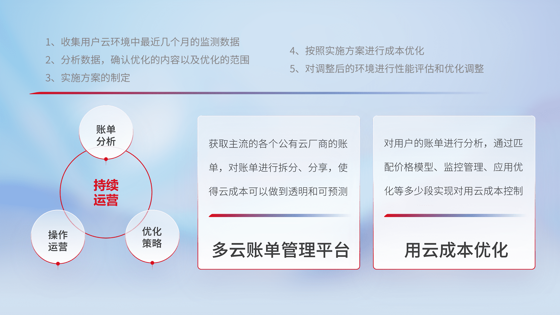 通过多云纳管,,,以统一的资源数据模型把客户的云资源进行抽象和封装,,,,进而实现对多云资源的统一操作,,,,保障云资源管理的可靠性、、稳定性与可用性。。。量身定制化运维内容,,,配置、、、、开发运维、、、补丁管理、、备份、、监控、、、、认证和访问管理、、、、审计和日常巡检等,,,,保障在用云过程中的可靠度,,稳定度以及高可用率。。