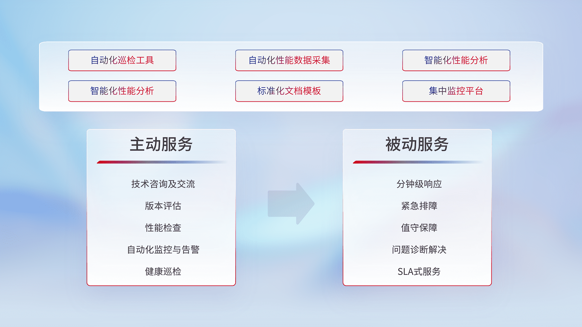 智能化工具和标准化文档,,,保障服务质量,,,提供主动服务(包含技术咨询、、、版本评估、、、性能检查、、、、自动化监控与告警、、、健康巡检)和被动服务包含(分钟级响应、、、、紧急排障、、、、值守保障、、、问题诊断解决、、、、SLA服务)。。